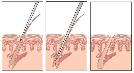 A electrologist inserts a very fine needle into the natural opening of the hair follicle alongside the hair shaft. A electrical current is then applied to destroy the hair germinative cells.